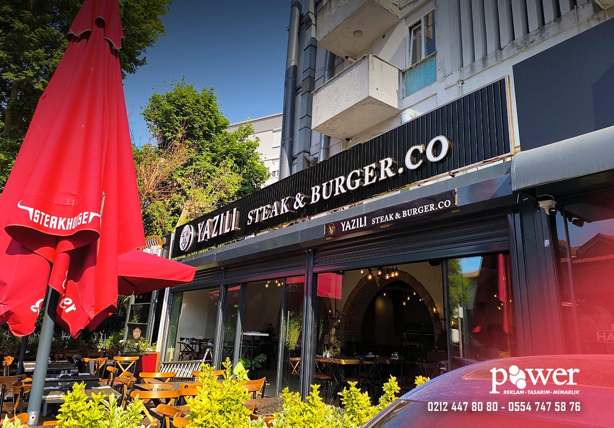 Yazılı Steak Burger için hazırladığımız tabela tasarımı ile markanın prestijini en şık şekilde yansıttık. Tasarımda kullanılan lambiri fırın boyalı zemin, modern ve güçlü bir arka plan oluştururken, marka kimliğini öne çıkaracak şekilde detaylandırıldı.